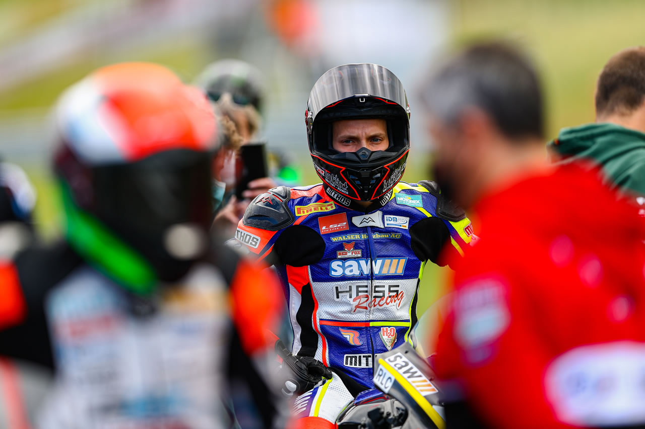 Ich konnte endlich meinen ersten Laufsieg in der IDM Superbike feiern. Dabei begann das Wochenende nicht gerade vielversprechend. Wir hatten wieder mit unerklärlichen technischen Problemen zu kämpfen. Die Elektronik zeigte einen Fehler an und die Gasannahme war weg. Das war gefährlich für mich und auch die anderen und ich verpasste eigentlich beide Qualifikationsessions. Nur in der ersten ist es mir kurz gelungen eine schnelle Runde zu drehen, welche dann für den Startplatz 4 reichte.