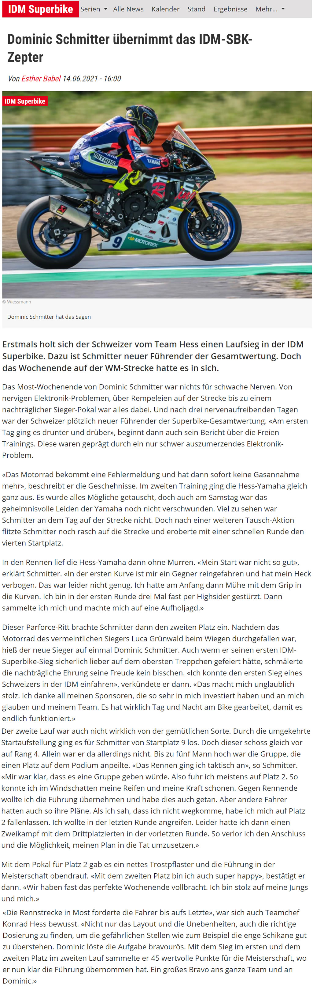 Aber ich kann zufrieden mit der Leistung vom gesamten Team und mir sein. Wir haben trotz der Widrigkeiten nicht aufgegeben und schlussendlich das Optimum an diesem Wochenende geschafft. Wir als HESS Racing Team führen erstmals das Klassement der IDM Superbike mit 14 Punkten Vorsprung an.