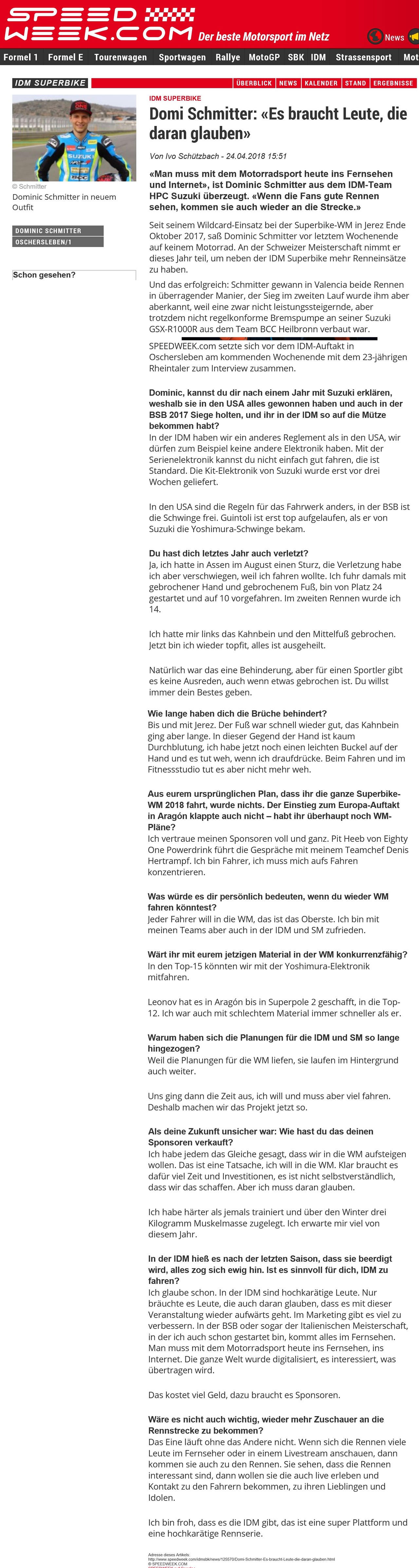 Ich bin froh und dankbar, dass ich wieder mit dem Team von Denis Hertrampf HPC Power die IDM bestreiten kann. Und ich freue mich sehr auf die Rennen in der SM mit Andi Gerlich BCC Racing, mit dem ich sehr gute Erinnerungen bei einem Gasteinsatz am Hockenheimring im Rahmen der IDM in der Supersportklasse teile. Die ersten beiden Rennen der Saison 2018 liefen für mich nach Mass. Startveranstaltung war die SM in Valencia. Ich konnte beide Rennen von der Pole mit einem Start-Ziel Sieg gewinnen. Da gab es aber noch eine kleine Strafe, wegen einer Reglementsverletzung...aber bitte lest selber...