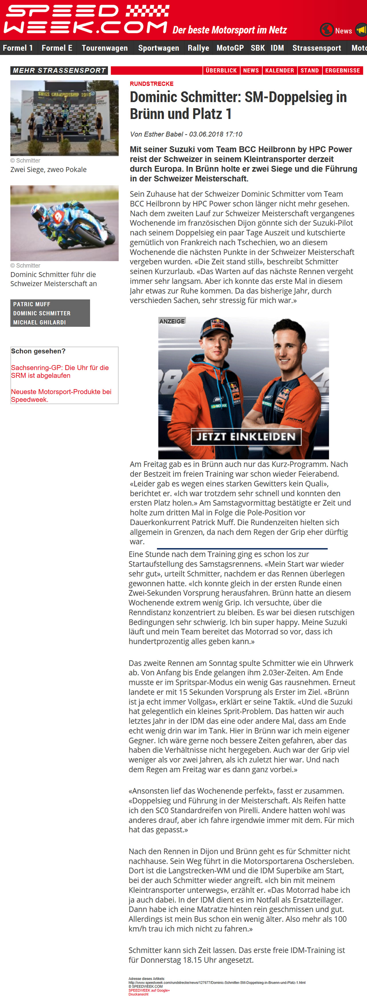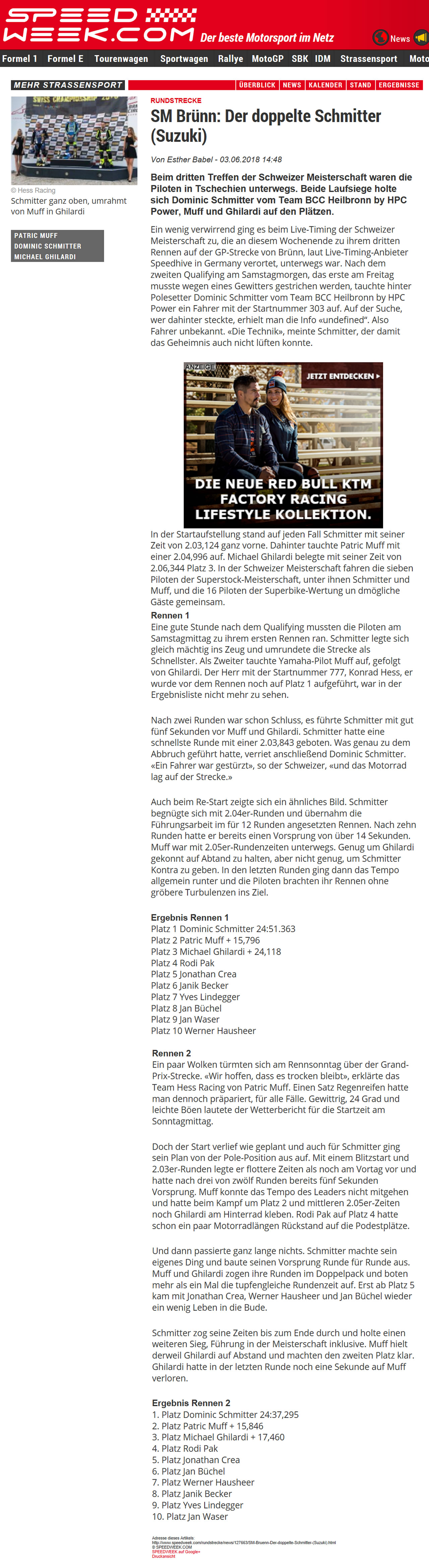 Der zweite Doppelsieg nach Mass in der Schweizermeisterschaft für unser Team. Dominic zeigte eine perfekte Performance und beförderte die Suzuki von BCC Racing Heilbronn powered by HPC-Power Racing auf Pole. Das gesamte Rennwochenende lief für uns perfekt, obwohl die Strecke uns ein paar Probleme bereitete. Auch an diesem Wochenende konnten wir vom ersten zum zweiten Rennen wiederum eine positive Lösung finden, welche es Dominic erlaubte seine Rennpace um 1s zu steigern. In beiden Rennen war Dominic eine Klasse für sich. Abstand zu den weiteren Podiumsplatzierten war am Ende jeweils grösser als 15s. Das zeigt uns, dass wir das Motorrad immer besser entwickeln. Beim ersten Rennen hatten wir ja noch keine Erfahrungen mit dem Bike. Wir haben bisher alle 6 Rennen gewonnen und führen die Meisterschaft an.