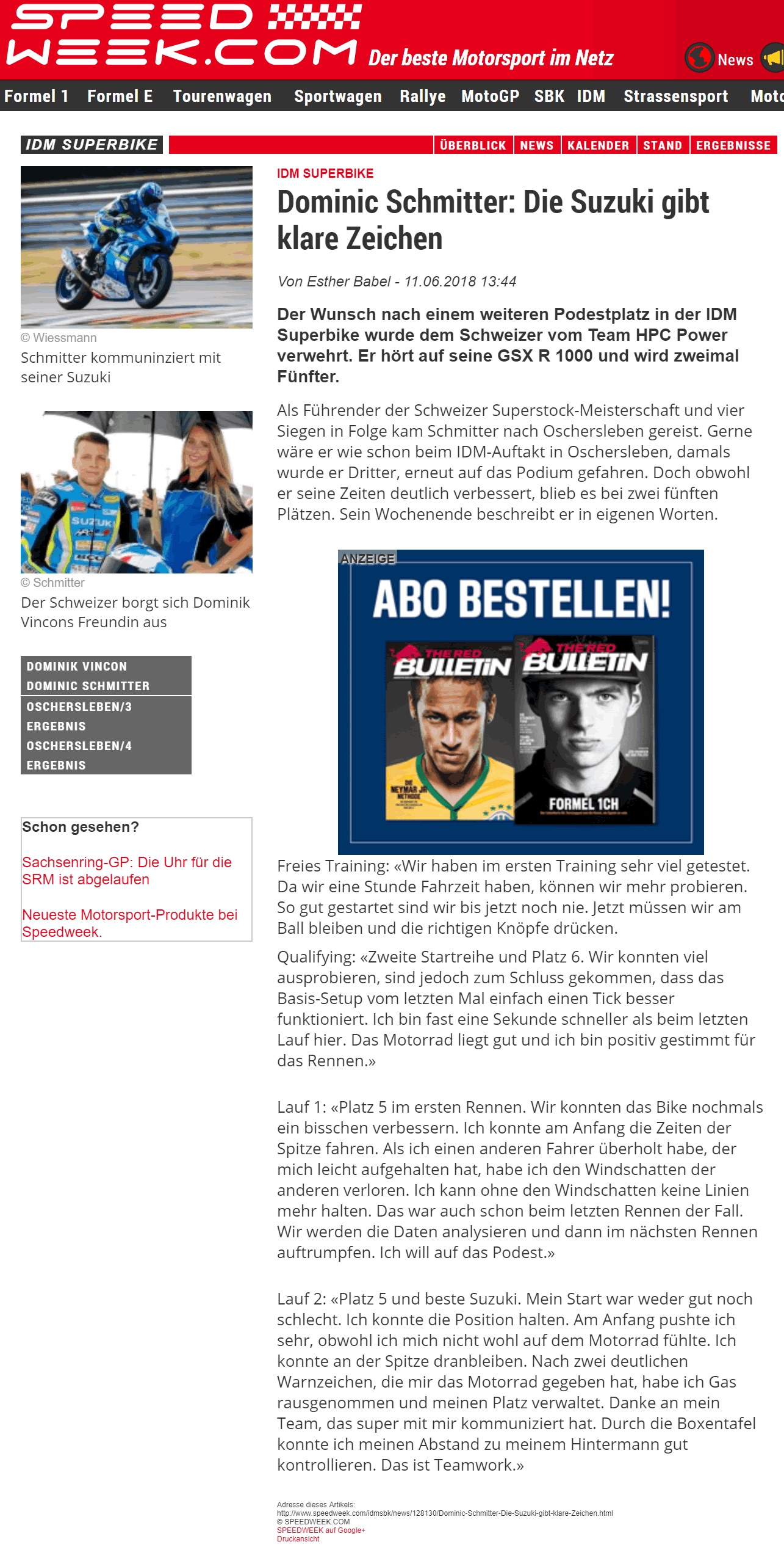 Derzeit geht es bei mir Schlag auf Schlag. Ich absolviere derzeit Rennen im Wochentakt. Die Rennen 3. und 4. in der Internationalen Deutschen Meisterschaft 2018 (www.idm.de) waren angesagt. Beim ersten Meeting konnte ich einen Ausfall und ein Podest verbuchen. Die Erwartungen waren hoch. Ich war mir jedoch bewusst, dass Siege wie in der Schweizer Meisterschaft mir nicht so schnell gelingen werden. Hier in der IDM ist der fahrerische Level sowie auch das Material und die Teams auf WM Ebene. Ganz vorne aufs Podest zu fahren wird nicht so einfach werden. Gegenüber dem ersten Meeting haben wir uns in den Zeiten auch um eine satte Sekunde gesteigert. Die anderen Top Teams aber eben auch. Im Grenzbereich habe ich immer noch Probleme die Suzuki bei 180° Kurven auf Linie zu halten. Wir konnten die Probleme in beiden Rennen nicht weg machen. Meine Leistung sehe ich mit 2 fünften Plätzen als solide.