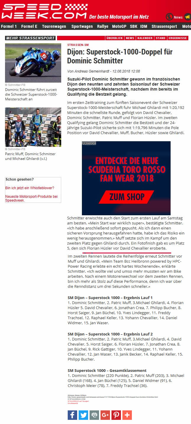 Das war ein hartes aber wiederum gelungenes Rennwochenende für unser BCC-Racing Team/HPC Power Suzuki. In jedem Training änderten wir das Setup um Dominic die Aufgabe, den Sieg zu holen, noch einfacher zu machen. Dominic konnte dann auch im Quali mit einer Zeit von 1:19:7 die absolute Pole setzen. Es ist einfach nur beeindruckend was Dominic aus einem Superstock 1000 Motorrad in der Lage ist herauszuholen. Hier zeigt sich die Klasse eines WM Rennfahrers, wenn er mit gleichem Material im Quali einfach so nochmals eine halbe Sekunde drauf packt. Dominic gehört definitiv zu jener Spezies von Rennfahrern die die Grenze des Motorrads und der Strecke voll ausloten, wenn Sie pushen. Beide Rennen hat er souverän für uns und sich gewonnen (ohne Risiko) und die Führung in der Gesamtwertung nun auf 17 Punkte ausgebaut. Jetzt steht unser Fokus voll auf das Finale in Brünn um den Titel der Schweizermeisterschaft zu sichern.