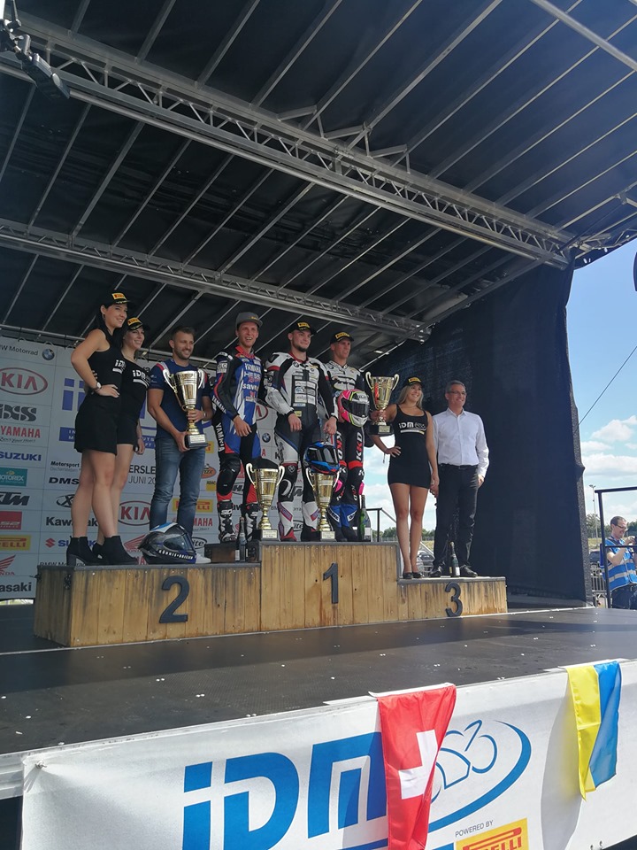 Beim ersten Rennen war meine Taktik, mich an die Werks BMW's zu heften und zu versuchen mit Ihnen dem Feld wegzufahren und dann abwarten und schauen was noch alles möglich ist. Genau das ist mir gelungen. Am Schluss konnte ich sogar noch einige Führungskilometer machen und mir den zweiten Platz auf dem Podest sichern. Beim zweiten Rennen haben auch wir in der IDM die umgekehrte Startreihenfolge, d.h. der Sieger startet von Platz 9 und so weiter. Ich musste also versuchen von der dritten Reihe Platz 8 so rasch als möglich nach vorne zu kommen. Ich musste aber feststellen, dass ich noch nicht Zweikampf stark bin. Die Handverletzung bremst mich hier ein. Ich kann nicht ganz so hart bremsen wie ich möchte und wenn ich stark pushe, ermüde ich in der Gashand. Trotzdem bin ich mit Platz 5 zufrieden.